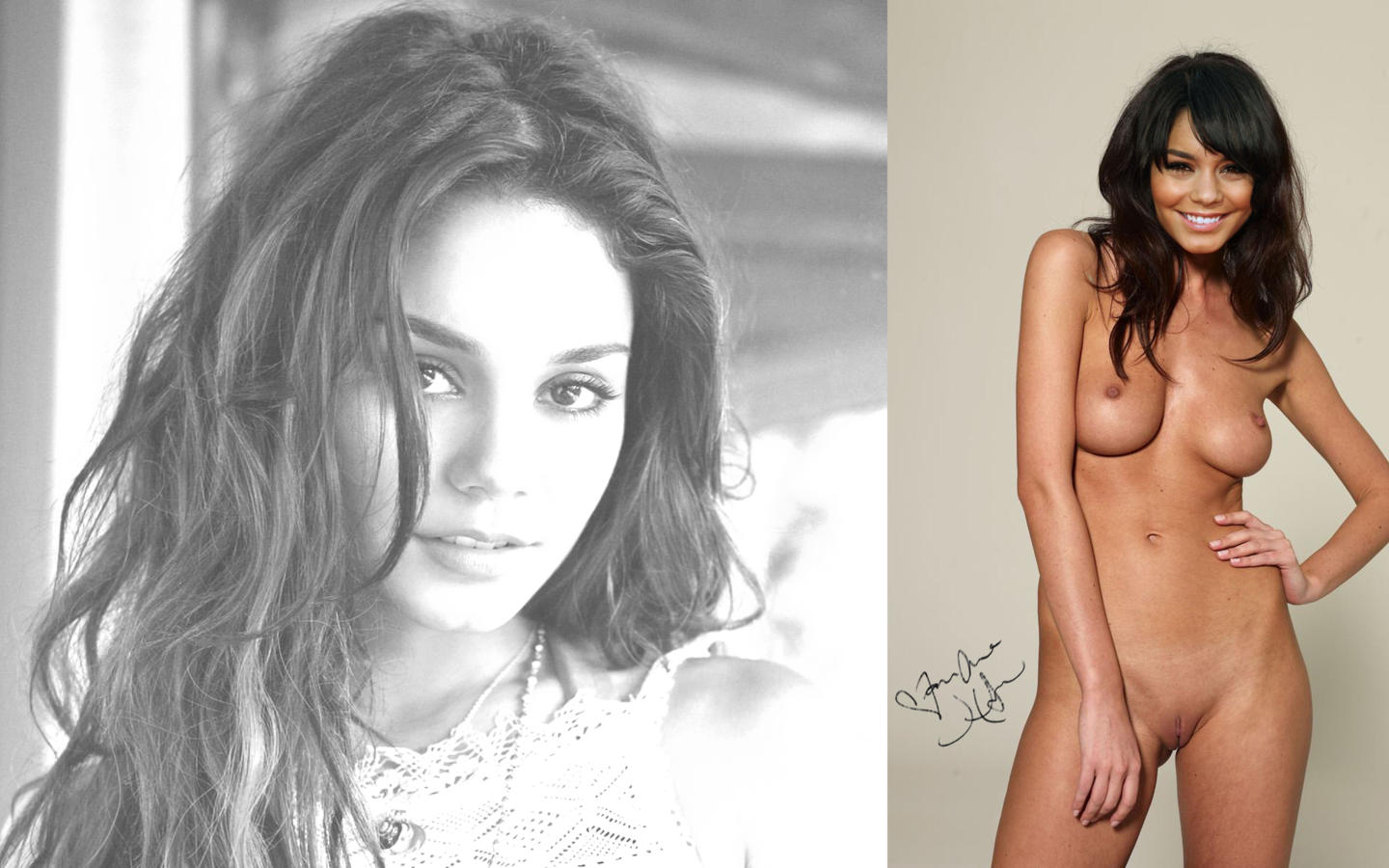 vanessa hudgens, brunette, natural boobs, pussy, shaved, smile, posing, compilation, collage, autograph, fake
