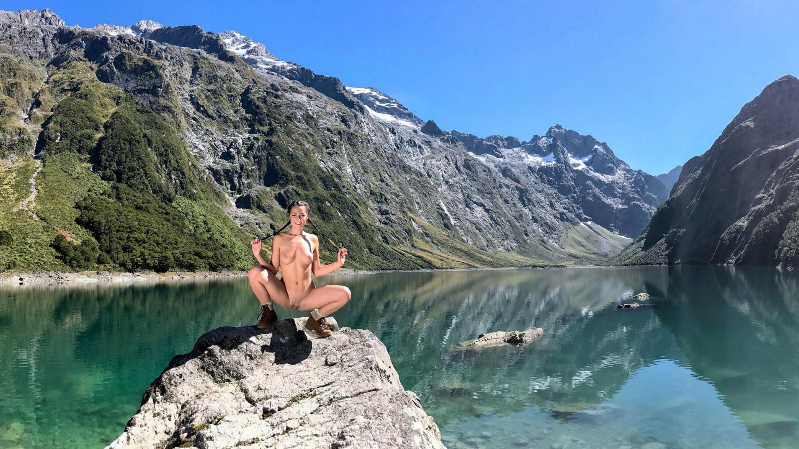 lily adams, brunette, pigtails, mountains, lake, panorama, wide angle, naked, boobs, big tits, nipples, shaved pussy, labia, squatting, spread legs, boots, smile, hi-q