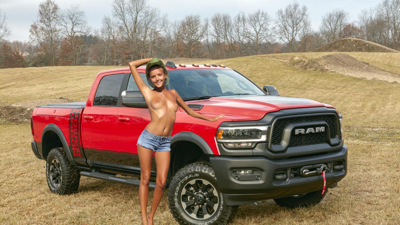 katya clover, clover, mango, caramel, mango a, brunette, denim shorts, dodge ram, 2019, topless, tanned, boobs, tits, nipples, cowboy hat, smile, hi-q