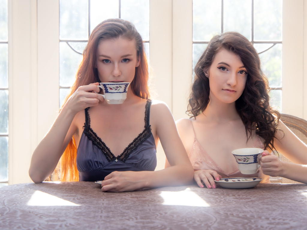 emily bloom, elizabeth reed, lingerie, tea, cup, brunette, 2 girls, anne t, tanya r, tania fox