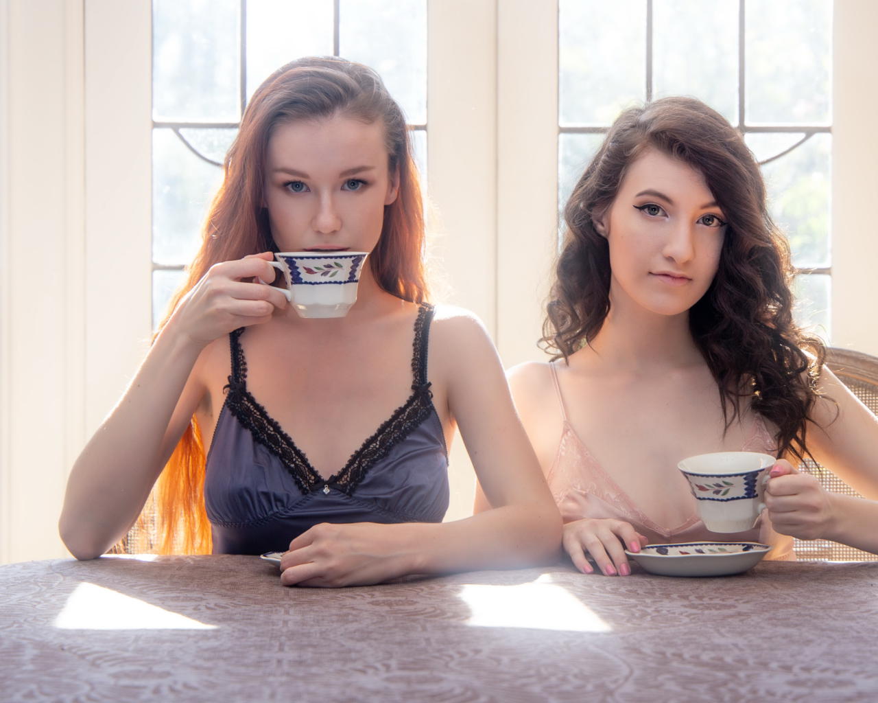 emily bloom, elizabeth reed, lingerie, tea, cup, brunette, 2 girls, anne t, tanya r, tania fox