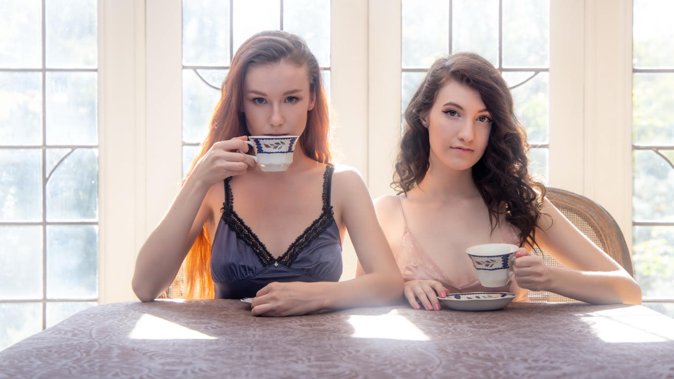 emily bloom, elizabeth reed, lingerie, tea, cup, brunette, 2 girls, anne t, tanya r, tania fox
