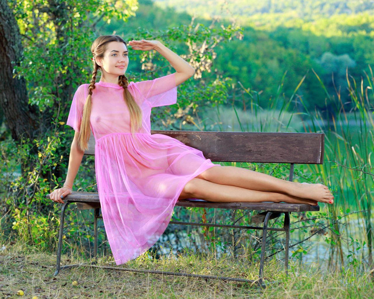 georgia, viva, susza k, brunette, dress, see through, outdoors, bench, naked, boobs, big tits, nipples, shaved pussy, smile, hi-q, pigtails, sheer