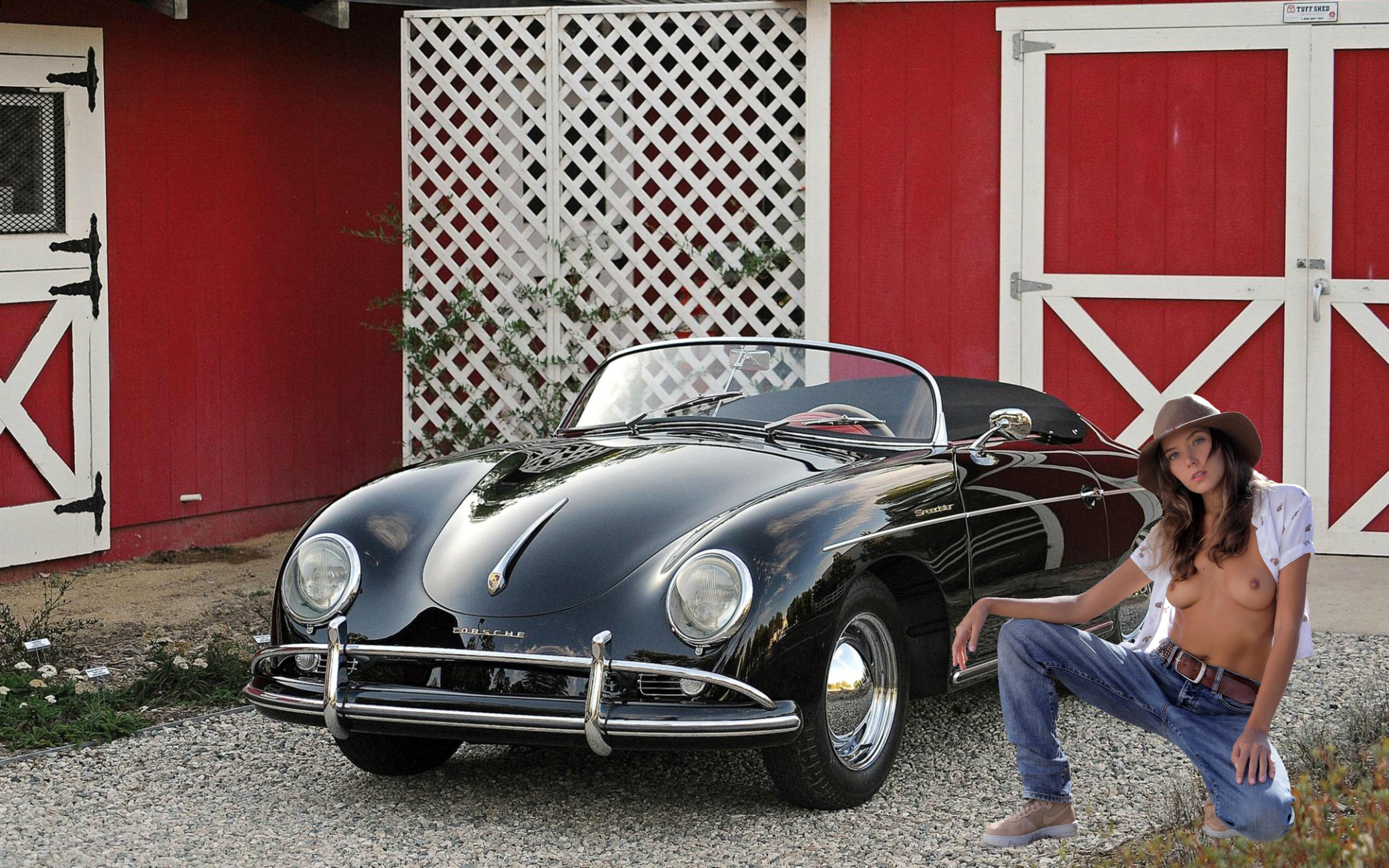 katya clover, clover, mango, caramel, brunette, car, porsche, topless, boobs, tits, nipples, jeans, running shoes, hat, hi-q, mango a, porsche 356