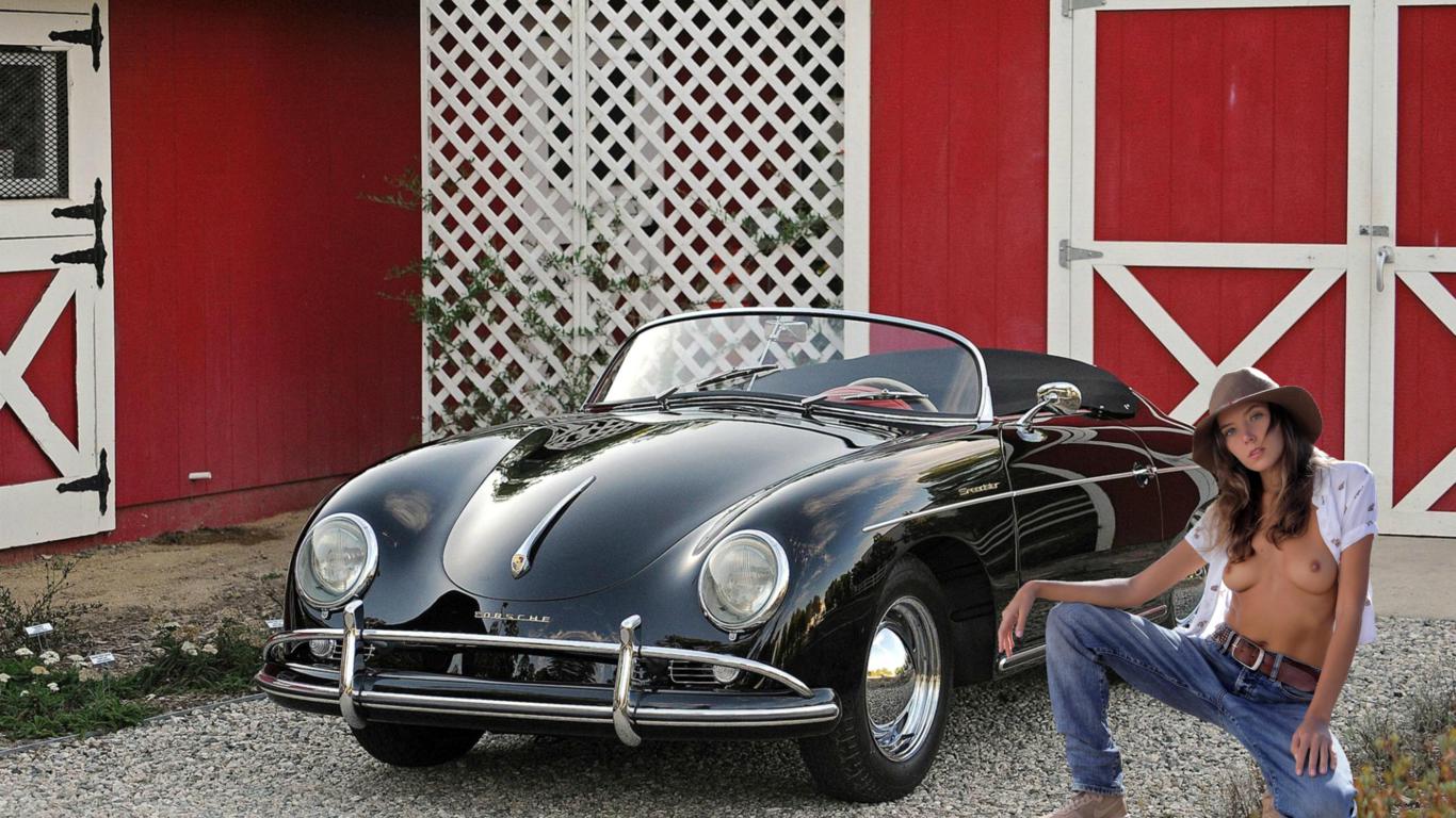 katya clover, clover, mango, caramel, brunette, car, porsche, topless, boobs, tits, nipples, jeans, running shoes, hat, hi-q, mango a, porsche 356