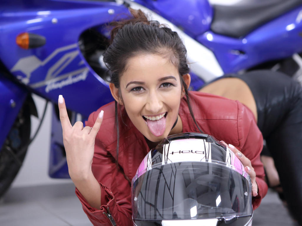 darcia lee, model, girl, brunette, face, smile, helmet, non nude