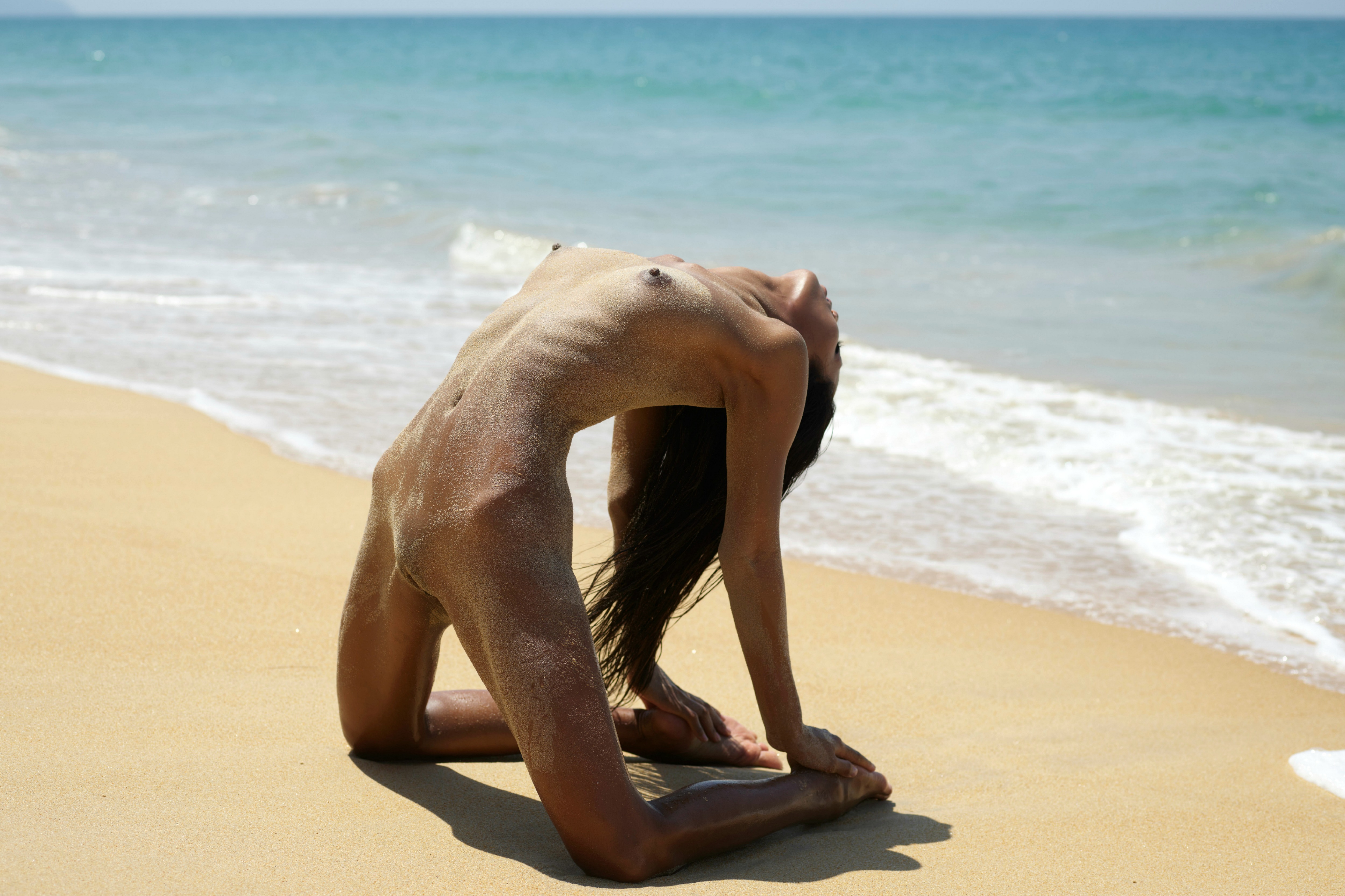 chloe, chloe r, chloe rose, brunette, beach, naked, sandy, boobs, tits, nipples, shaved pussy, labia, kneeling, hi-q