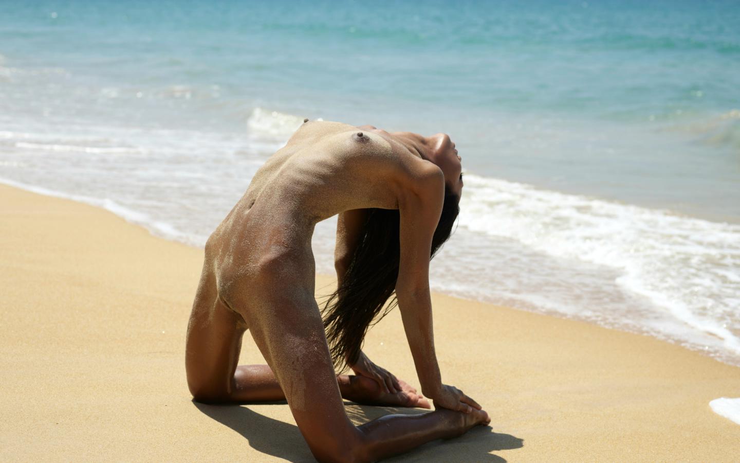 chloe, chloe r, chloe rose, brunette, beach, naked, sandy, boobs, tits, nipples, shaved pussy, labia, kneeling, hi-q