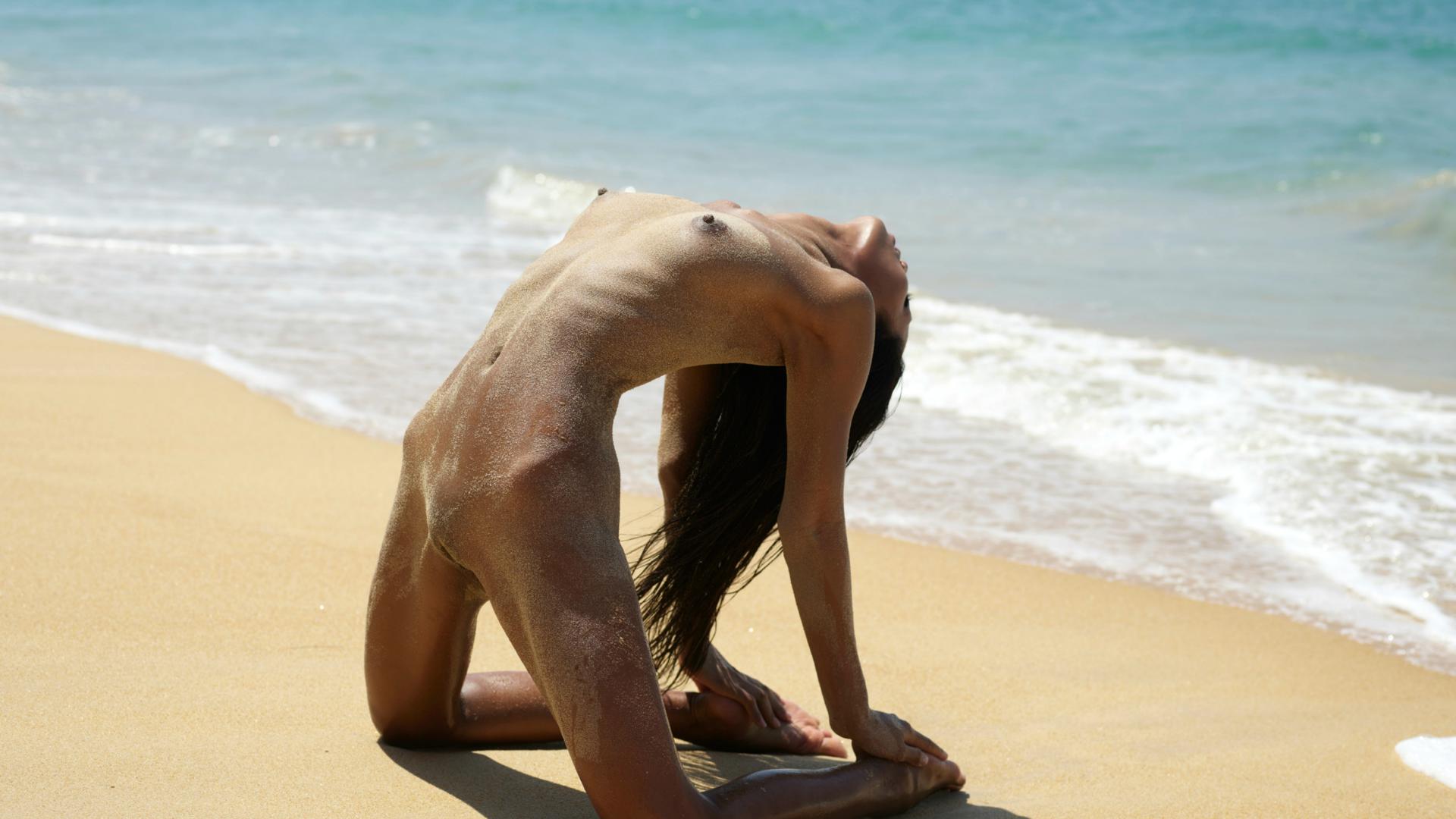 chloe, chloe r, chloe rose, brunette, beach, naked, sandy, boobs, tits, nipples, shaved pussy, labia, kneeling, hi-q