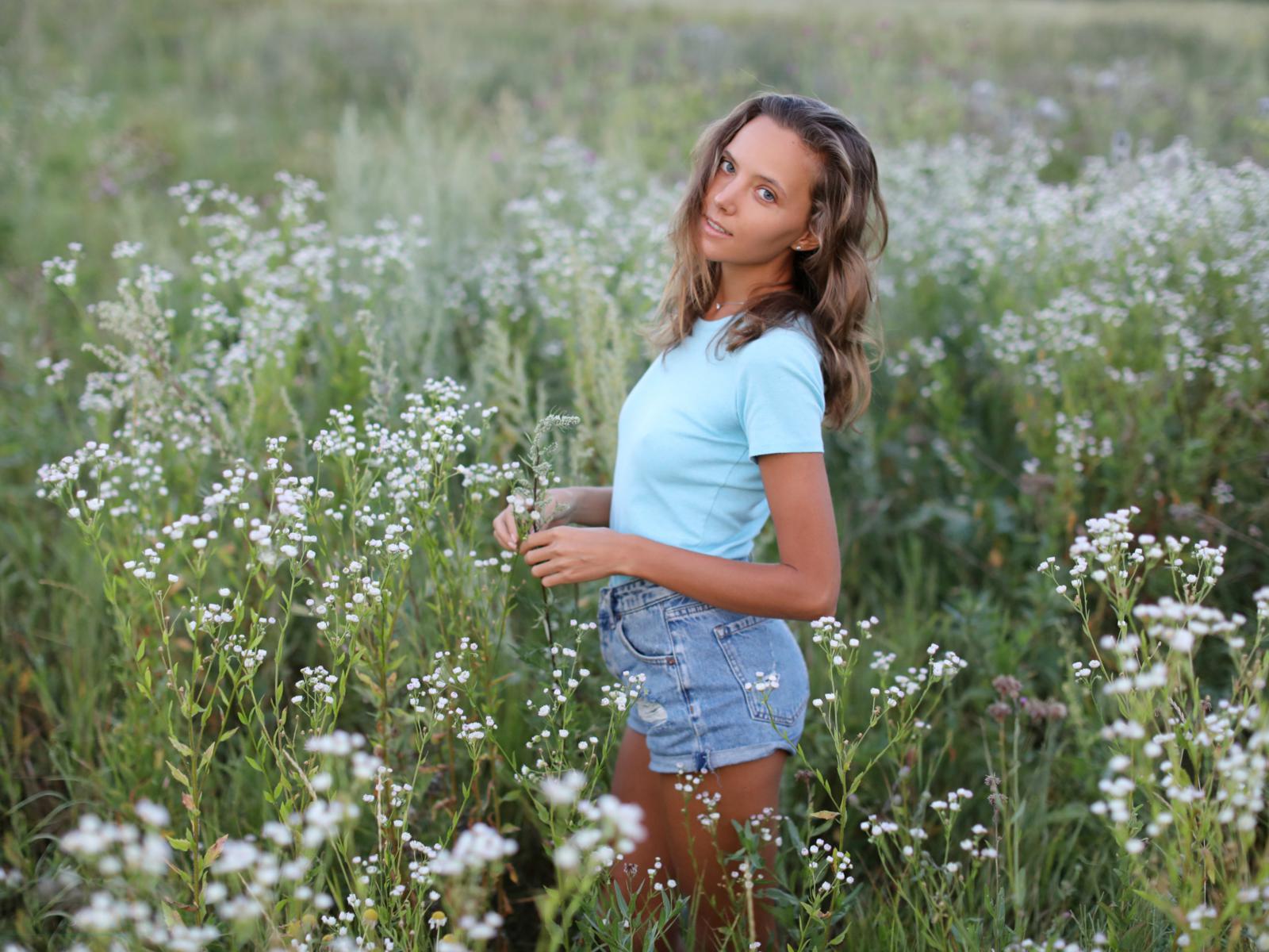 katya clover, clover, mango, caramel, mango a, brunette, non nude, field, flowers, tee shirt, denim, shorts, smile, hi-q, denim shorts