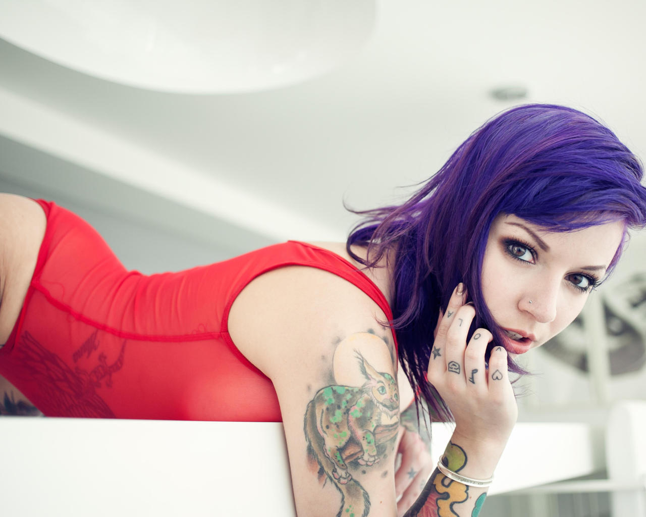 rebecca crow, katherine, suicide girls, tattoo, big  tits, purple hair, red lingerie