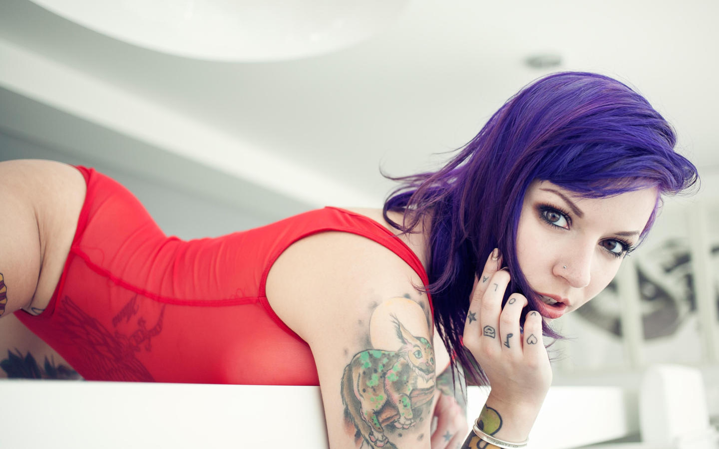 rebecca crow, katherine, suicide girls, tattoo, big  tits, purple hair, red lingerie