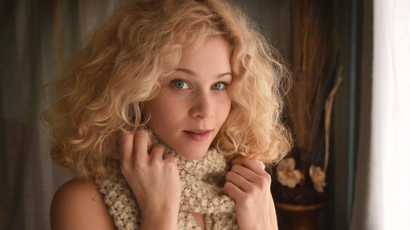 helena, blonde, blue eyes, cute, close up, face, freckles, scarf, emma o, curly