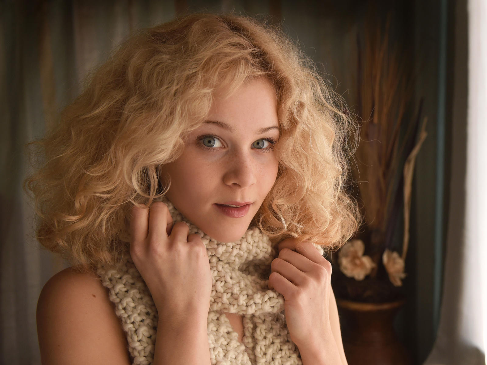 helena, blonde, blue eyes, cute, close up, face, freckles, scarf, emma o, curly