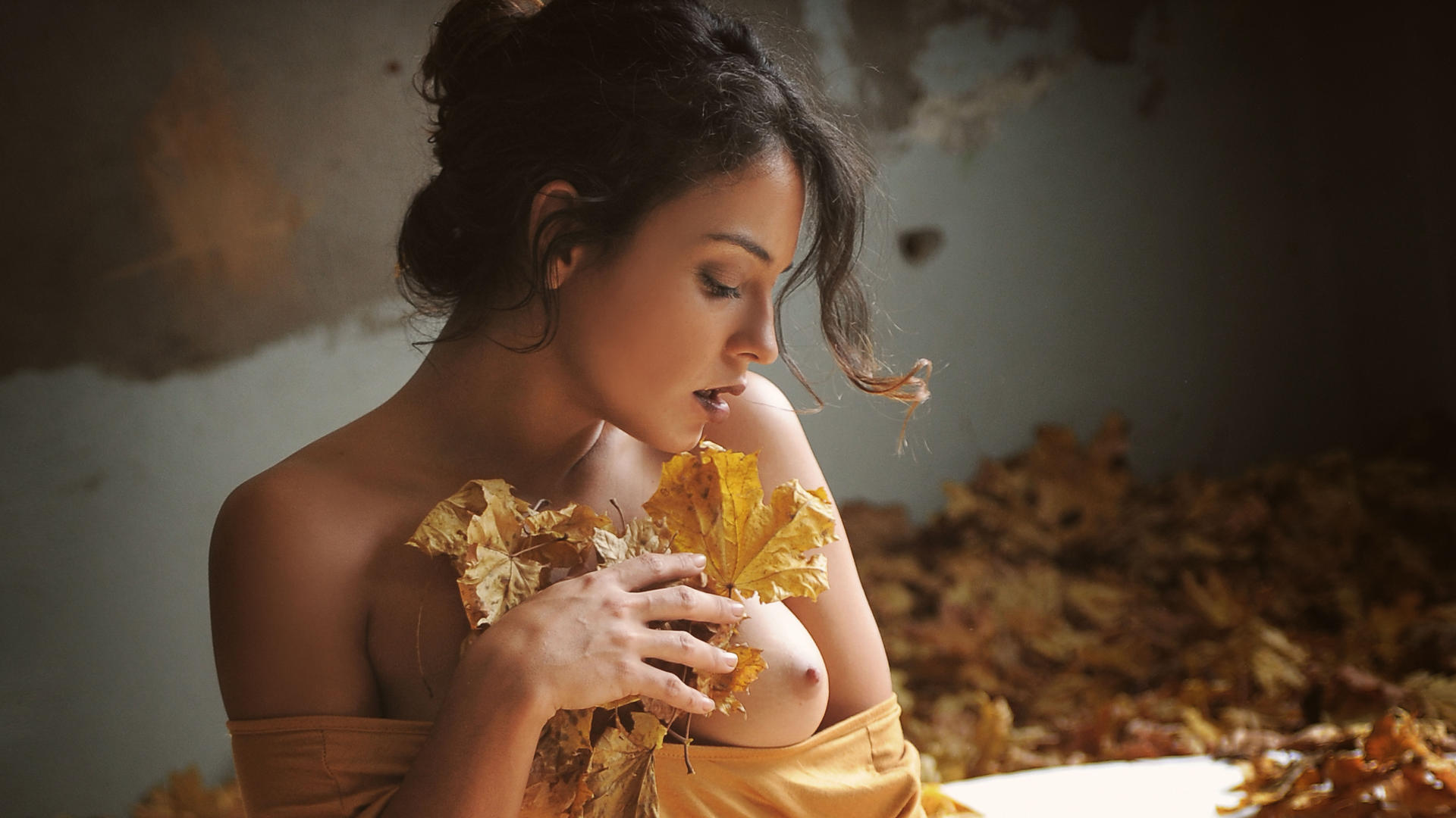 joy lamore, dark hair, tanned, leaves, autumn, close up, tits, nipples, boobs