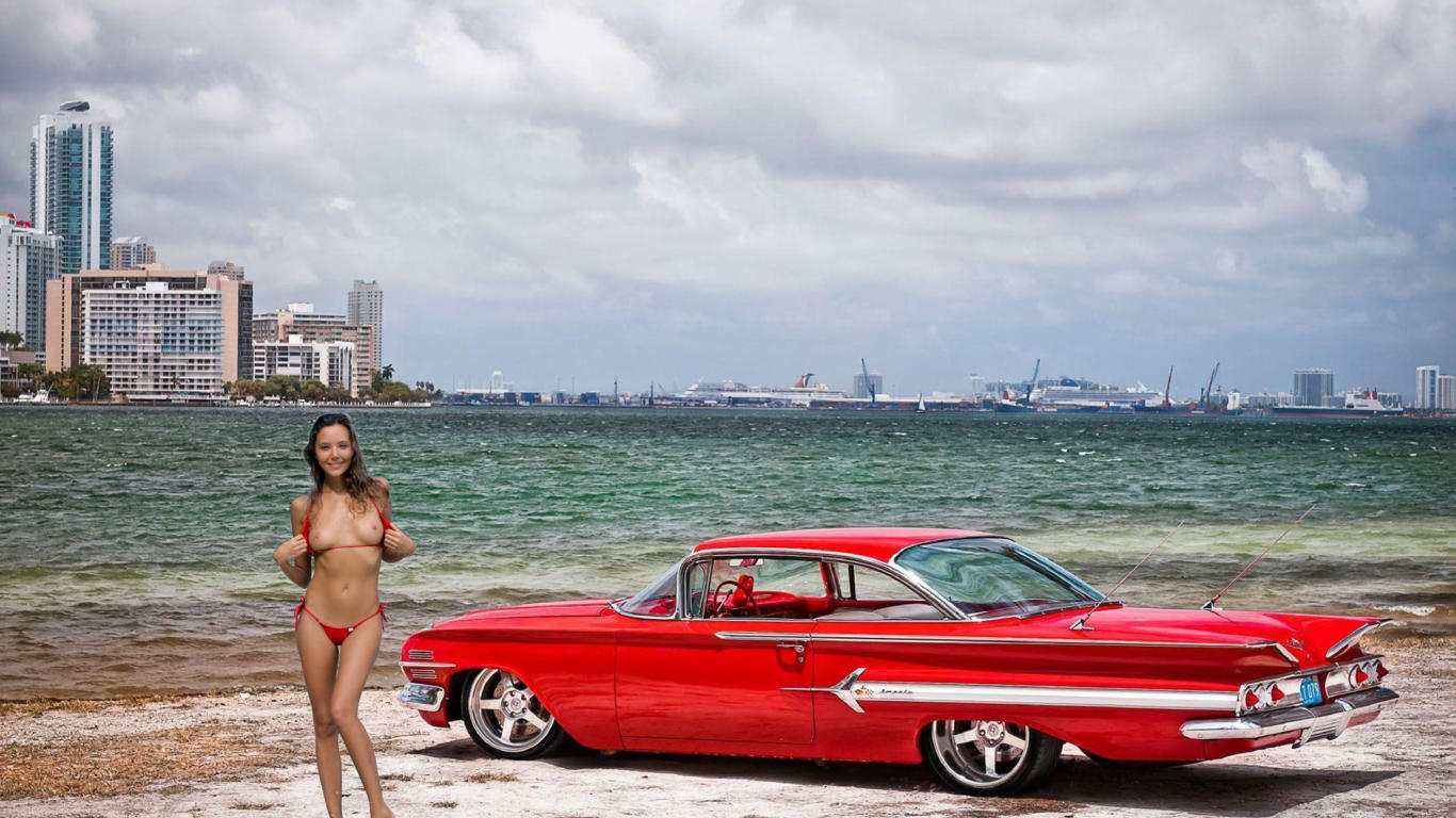 katya clover, clover, mango, caramel, mango a, brunette, outdoors, beach, car, chevolet, impala, 1960, bikini, topless, boobs, tits, nipples, smile, hi-q