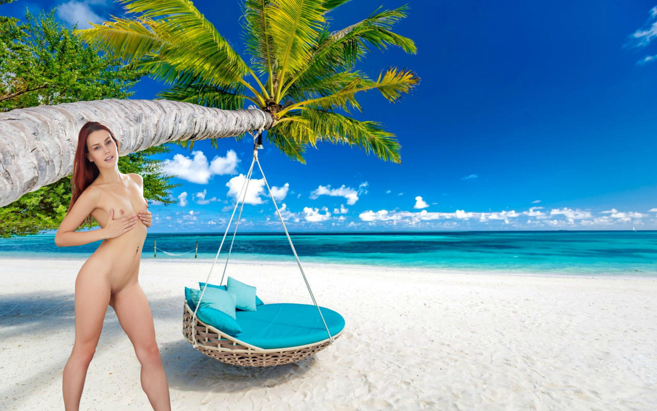 charlie red, charli red, tereza, redhead, beach, naked, boobs, tits, nipples, handbra, shaved pussy, smile, hi-q