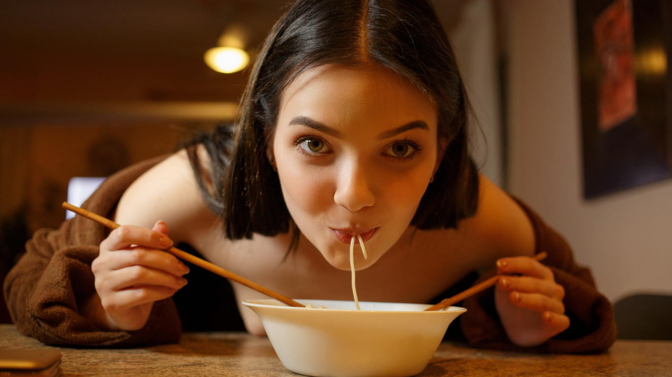chanel fenn, cali, sandra, hot, model, sexy, teen, young, hi-q, sweet, smile, black hair, boobs, tits, small tits, brunette, spaghetti, face, cute, eating, food