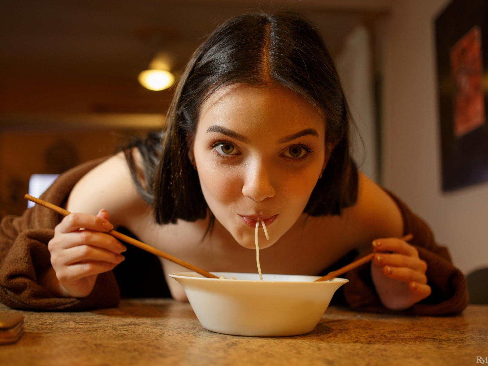 chanel fenn, cali, sandra, hot, model, sexy, teen, young, hi-q, sweet, smile, black hair, boobs, tits, small tits, brunette, spaghetti, face, cute, eating, food