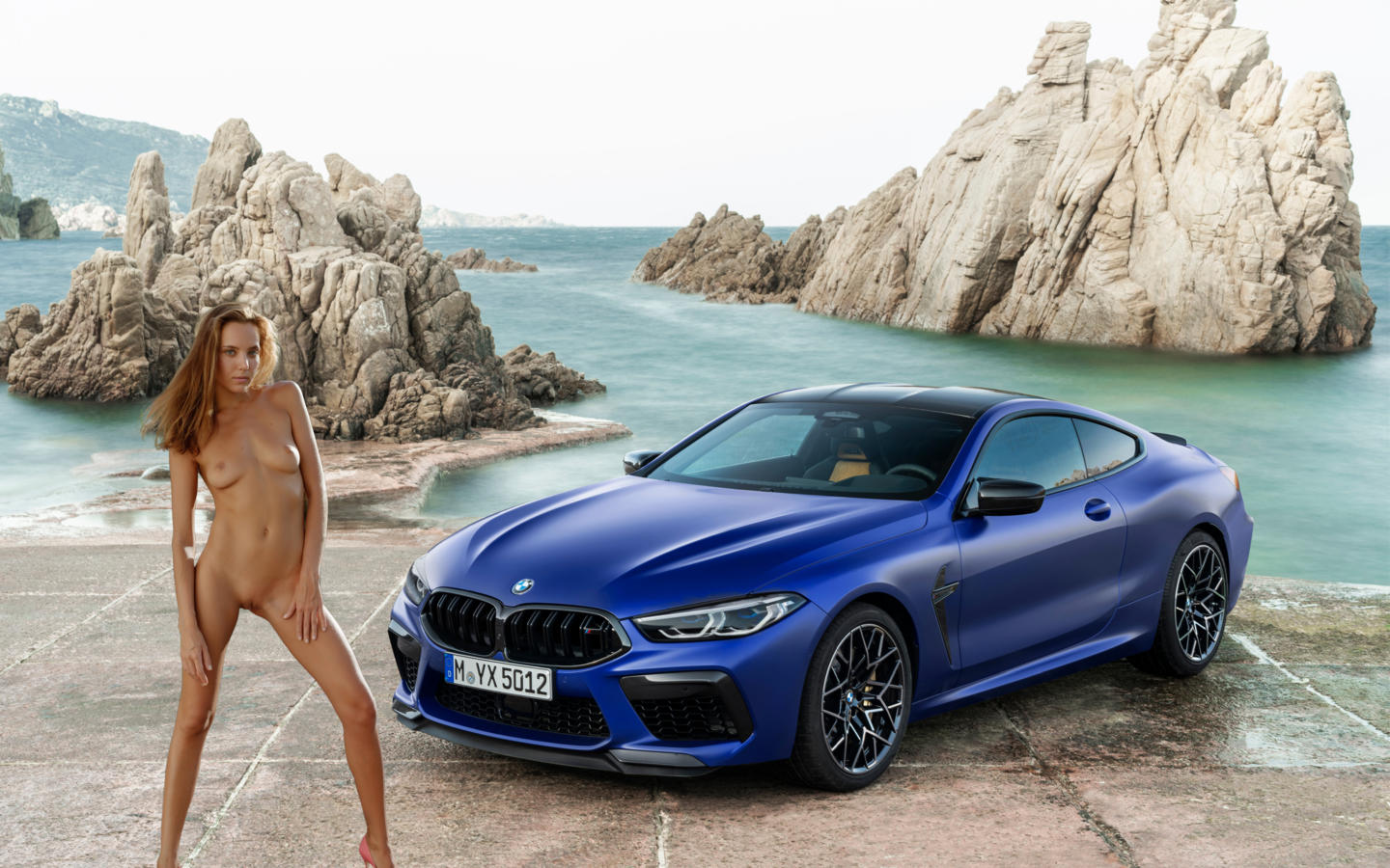 katya clover, clover, mango, caramel, mango a, brunette, outdoors, car, bmw, naked, tanned, boobs, tits, nipples, shaved pussy, labia, spread legs, high heels, hi-q
