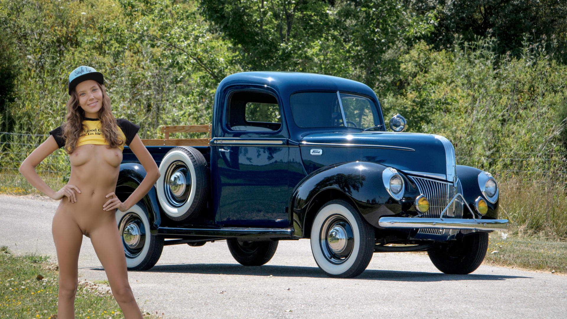 katya clover, clover, mango, caramel, mango a, brunette, outdoors, truck, ford, 1941, shirt, hat, naked, tanned, boobs, tits, nipples, shaved pussy, labia, spread legs, smile, hi-q