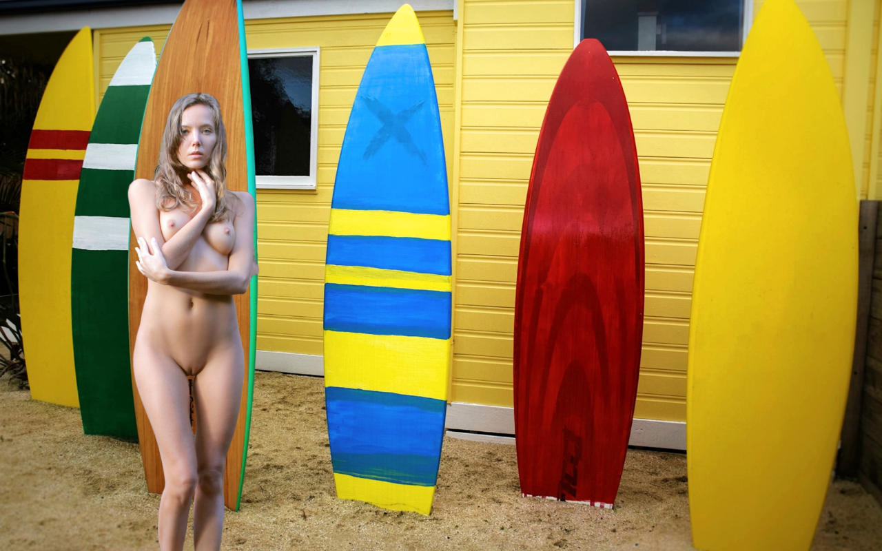 katya clover, clover, mango, caramel, mango a, brunette, outdoors, surfboards, naked, boobs, tits, nipples, shaved pussy, hi-q, surfboard, surf board