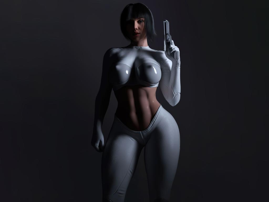 motoko kusanagi, scarlett johansson, cosplay, anime, manga, big tits, curvy, gun, dark