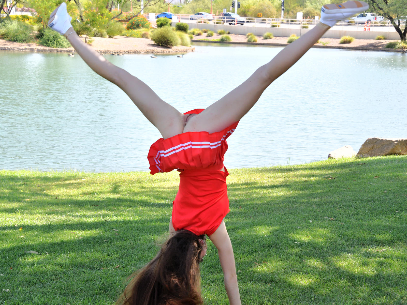 tori, brunette, outdoors, river, skirt, bottomless, handstand, naked, shaved pussy, labia, ass, spread legs, running shoes, hi-q