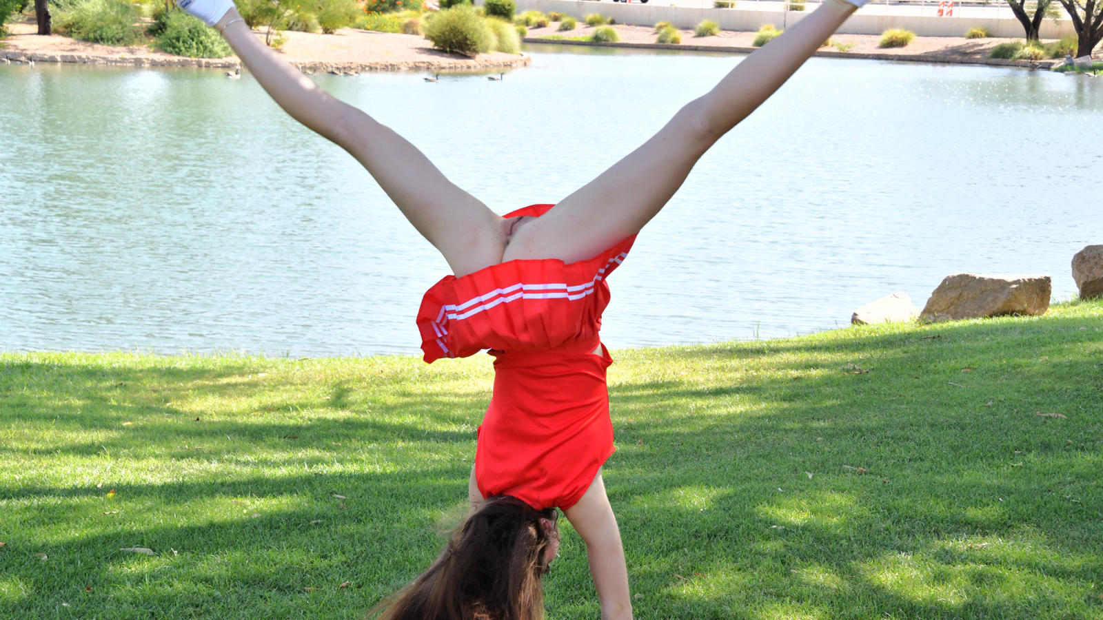 tori, brunette, outdoors, river, skirt, bottomless, handstand, naked, shaved pussy, labia, ass, spread legs, running shoes, hi-q