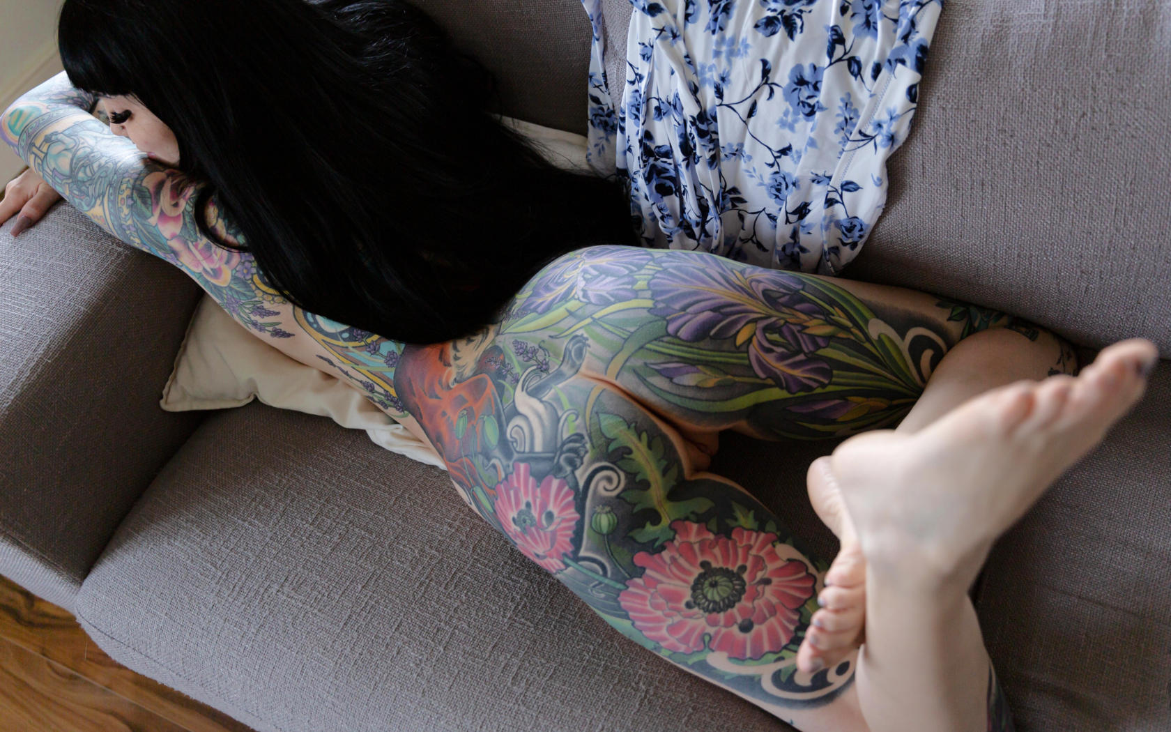 luna blu, brunette, sofa, naked, pov, shaved pussy, labia, ass, tattoo, hi-q