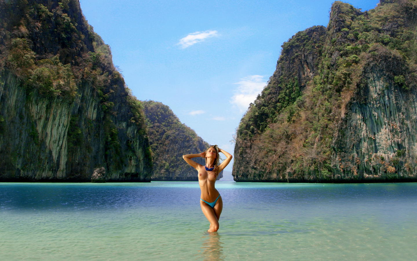 girls, tits, big, nude, naked, model, juicy, sea, lagoon, topless, panties, sea, sky, cliffs, island, scenic, view, thailand