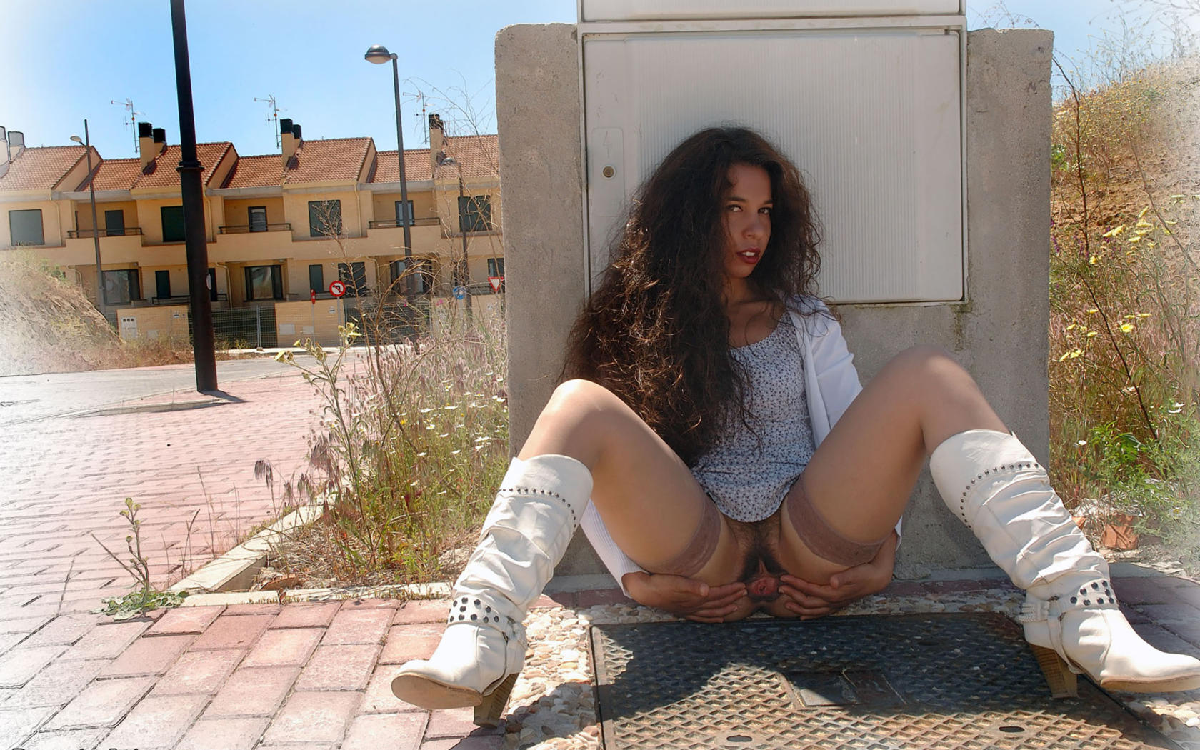 idoia a, model, pussy, stockings, spreading, legs, boots, brunette, dress, hairy pussy, labia, knee boots, idoia durante, beaver
