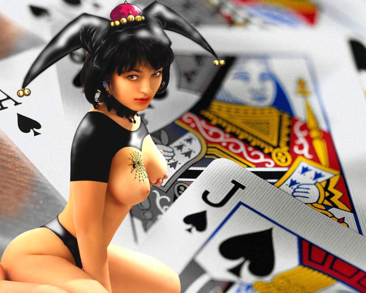 girls, fantasy, nude, boobs, tits, brunette, cards, joker, jester, 3d, graphics