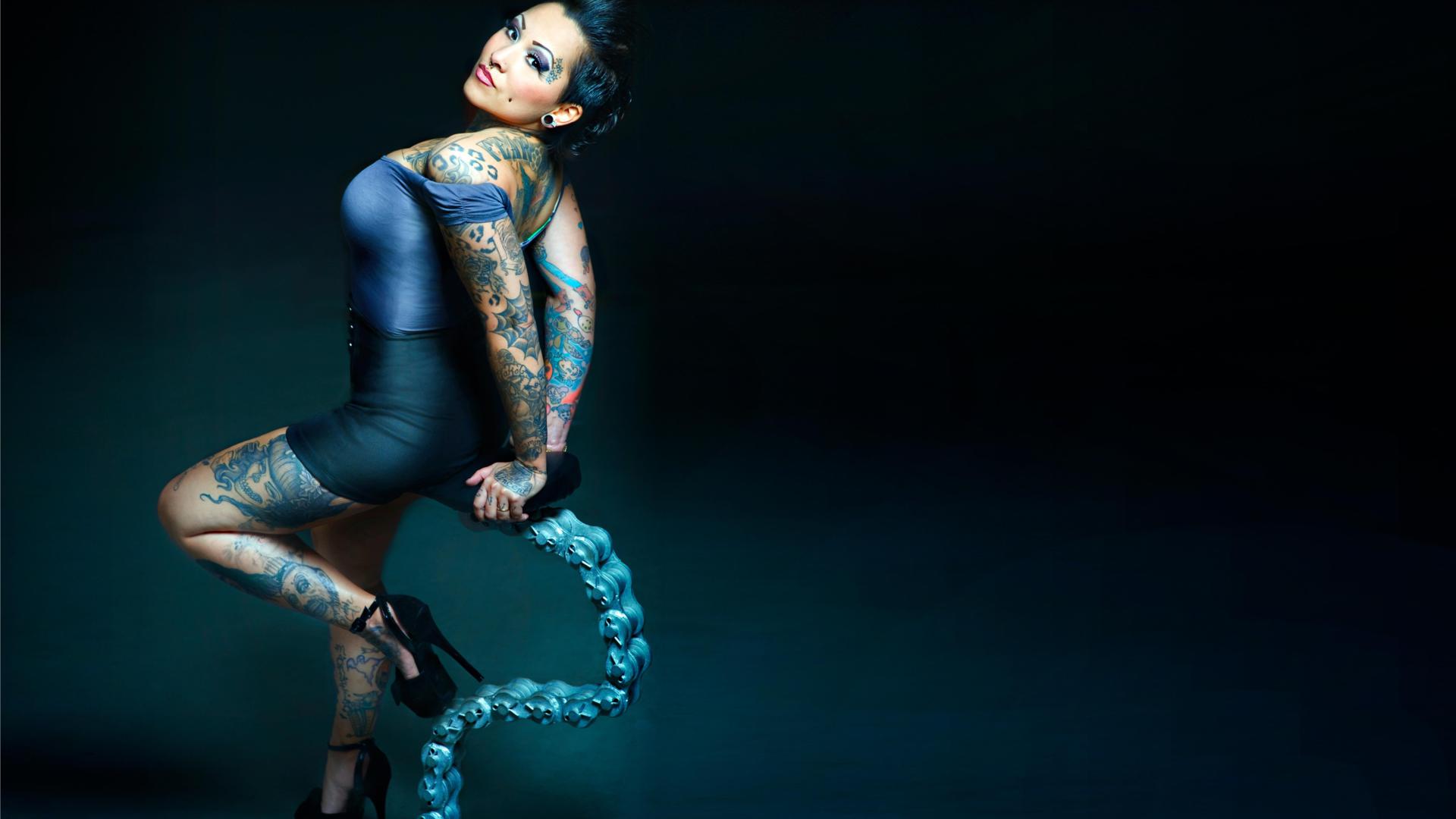 envy, envy von needles, brunette, updo hairstyle, sexy babe, tattoos, sexy dressed, posing, body art, tattoo, piercing, erotic art, pin up style, modern, curves, female, femme fatale, full size cut, widescreen cut, heels, legs, plateau heels, hi-q