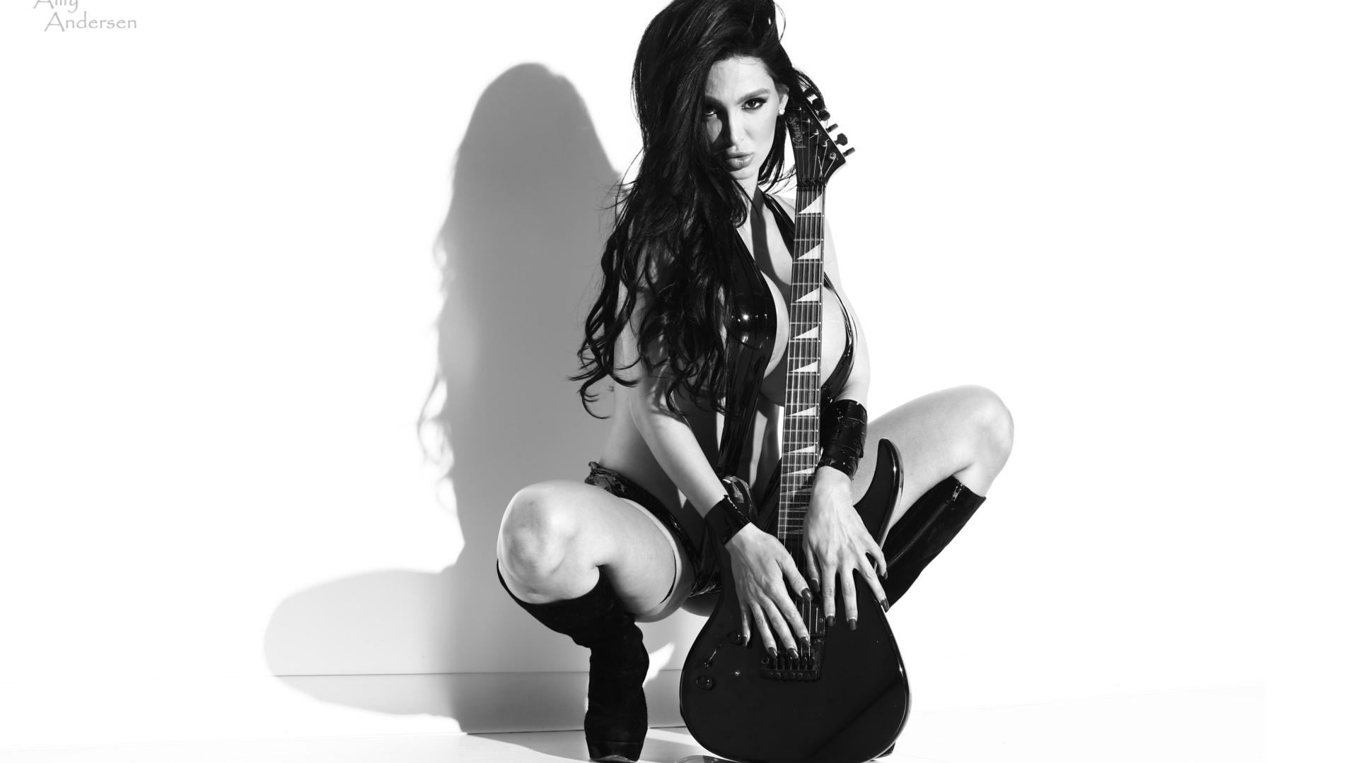 amy anderssen, model, pornstar, brunette, long hair, sexy babe, kneeling, boots, lingerie, guitar, spread, legs, amy, black, shiny, monokini, decollete, black and white, minimalist wall, hi-q, babes in boots