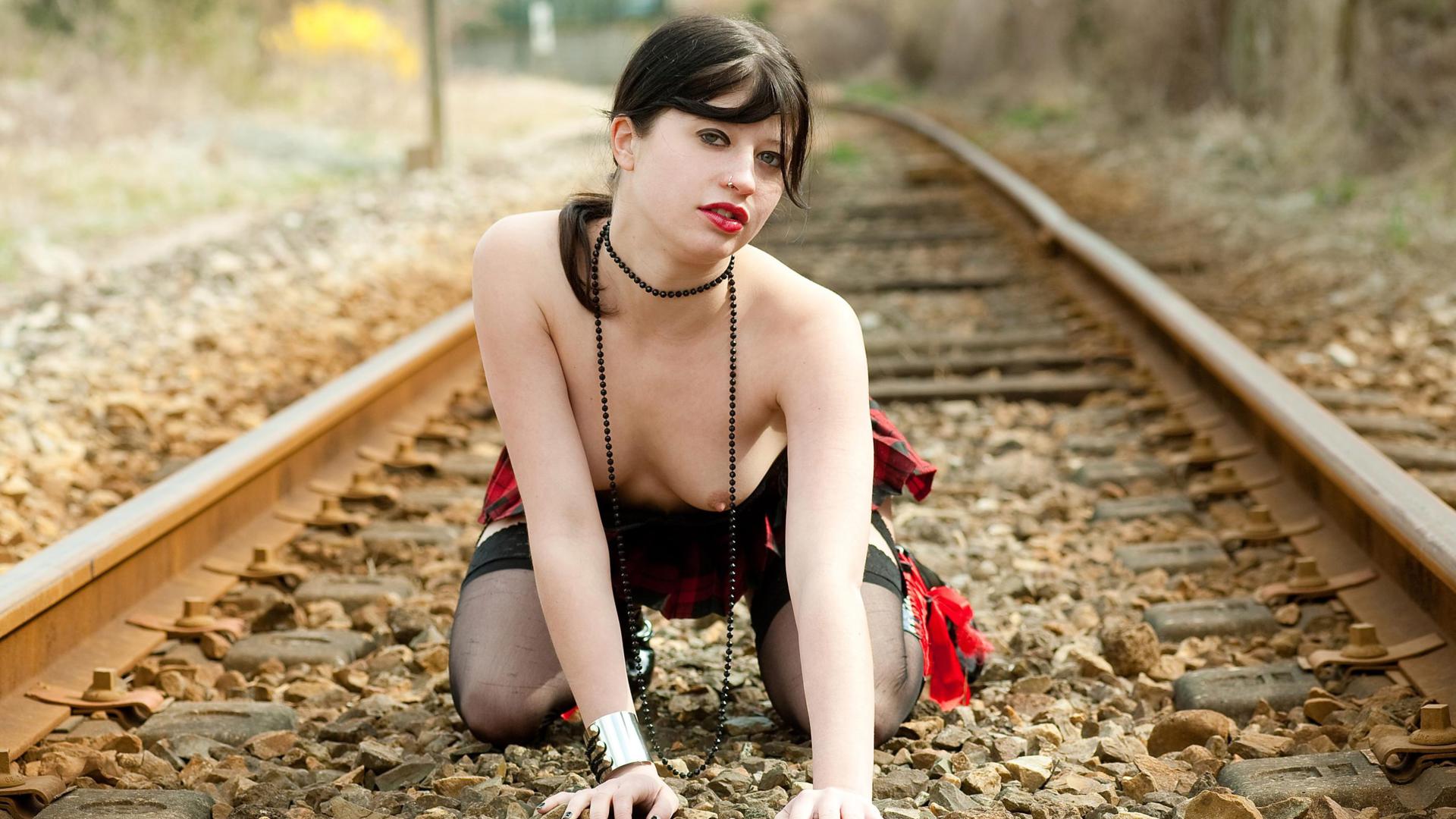 lola, young, brunette, sexy babe, kneeling, doggy, railroad track, outdoor, miniskirt, corset, lingerie, stockings, pvc, boots, piercing, tiny tits, railline, lola c, lola fetish railroad, fetish babe