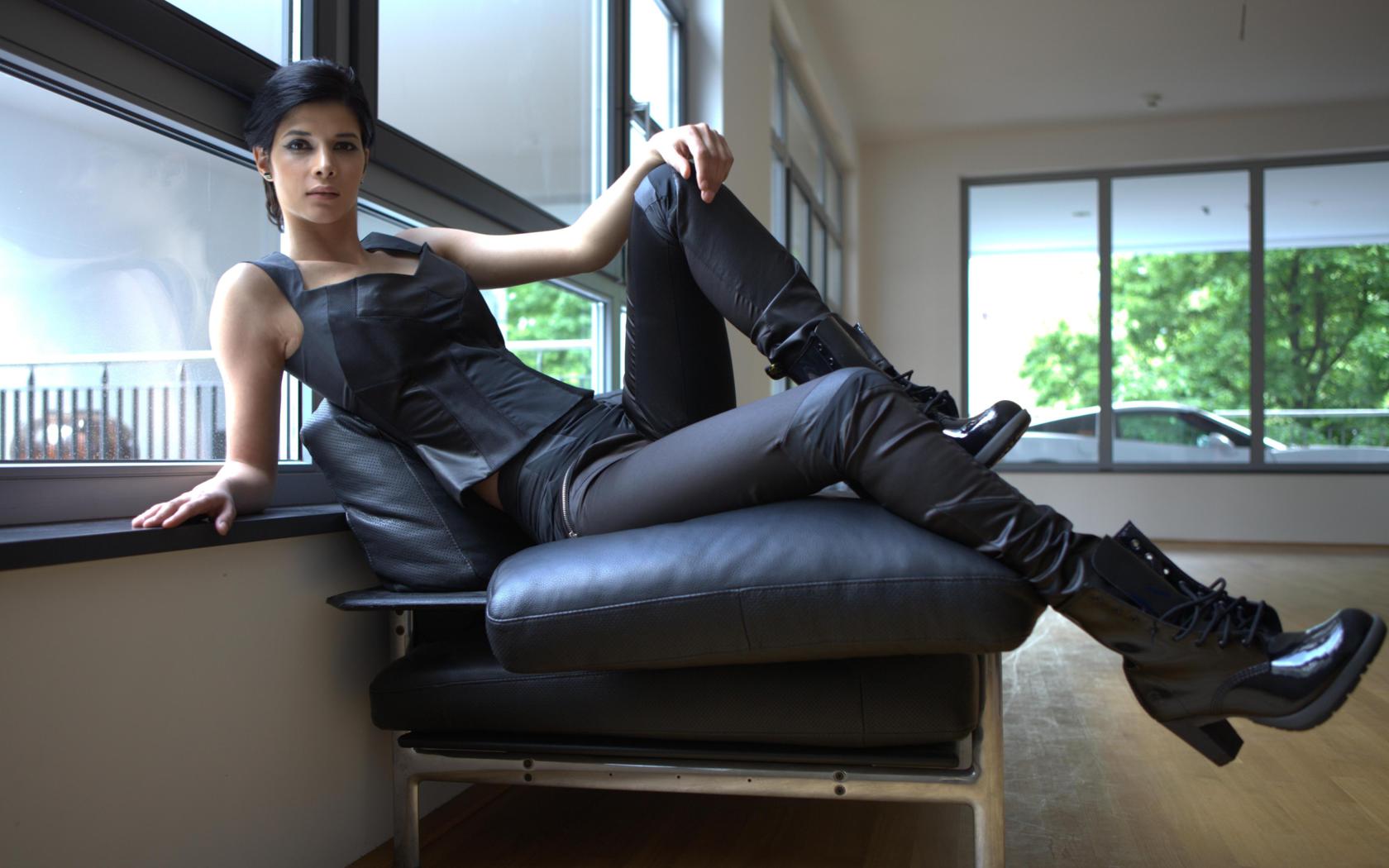 micaela schaefer, german, professional nudist, model, brunette, sexy dressed, personality, starlet, ankle boots, window, micaela, hi-q, real celebs wall