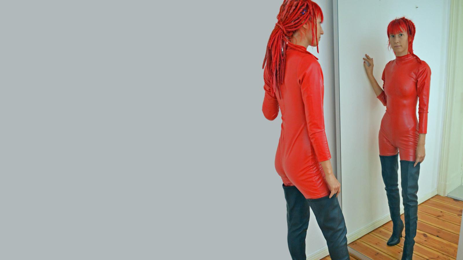 nicki, redhead, german, amateur, model, slim, sexy babe, dreadlocks, mirror, reflection, posing, shiny clothes, red, lycra, catsuit, black, leather, overknee, crotch boots, tight clothes, erotic, minimalist wall, own cut, lingerie series, loverso