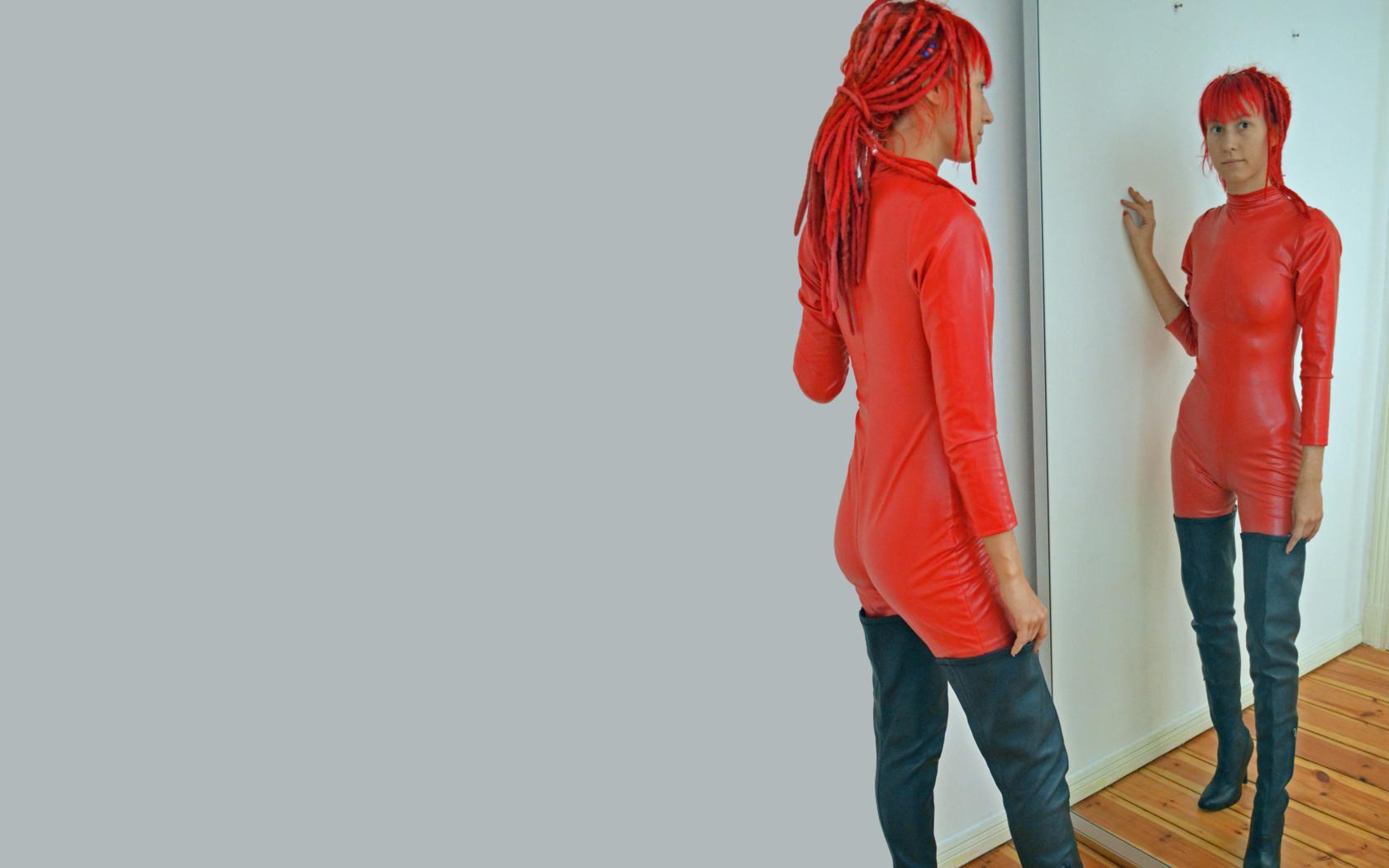 nicki, redhead, german, amateur, model, slim, sexy babe, dreadlocks, mirror, reflection, posing, shiny clothes, red, lycra, catsuit, black, leather, overknee, crotch boots, tight clothes, erotic, minimalist wall, own cut, lingerie series, loverso