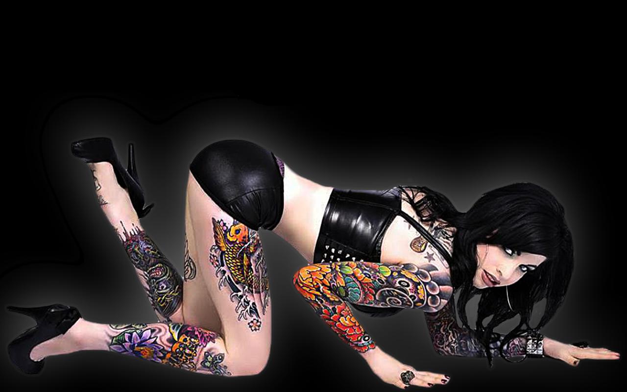 sarah christine, brunette, american, tattoo, alternative, model, sexy babe, long hair, posing, kneeling, shiny, tight clothes, top, miniskirt, tattoos, body art, lo-q, fetish babe