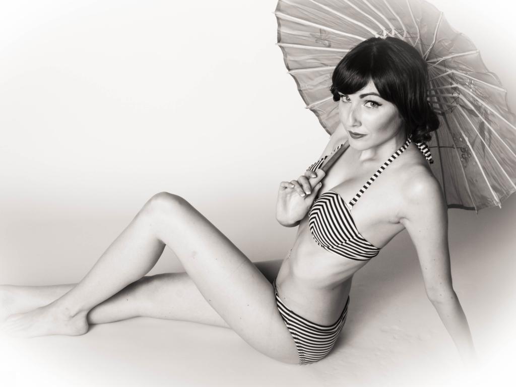 young, brunette, amateur, model, slim, sexy babe, short hair, posing, sitting, smile, umbrella, bikini, black and white, pin up style, hi-q, erotic art