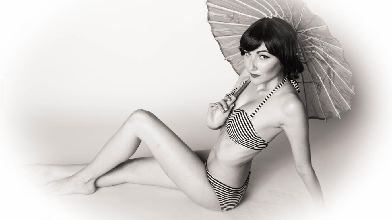 young, brunette, amateur, model, slim, sexy babe, short hair, posing, sitting, smile, umbrella, bikini, black and white, pin up style, hi-q, erotic art