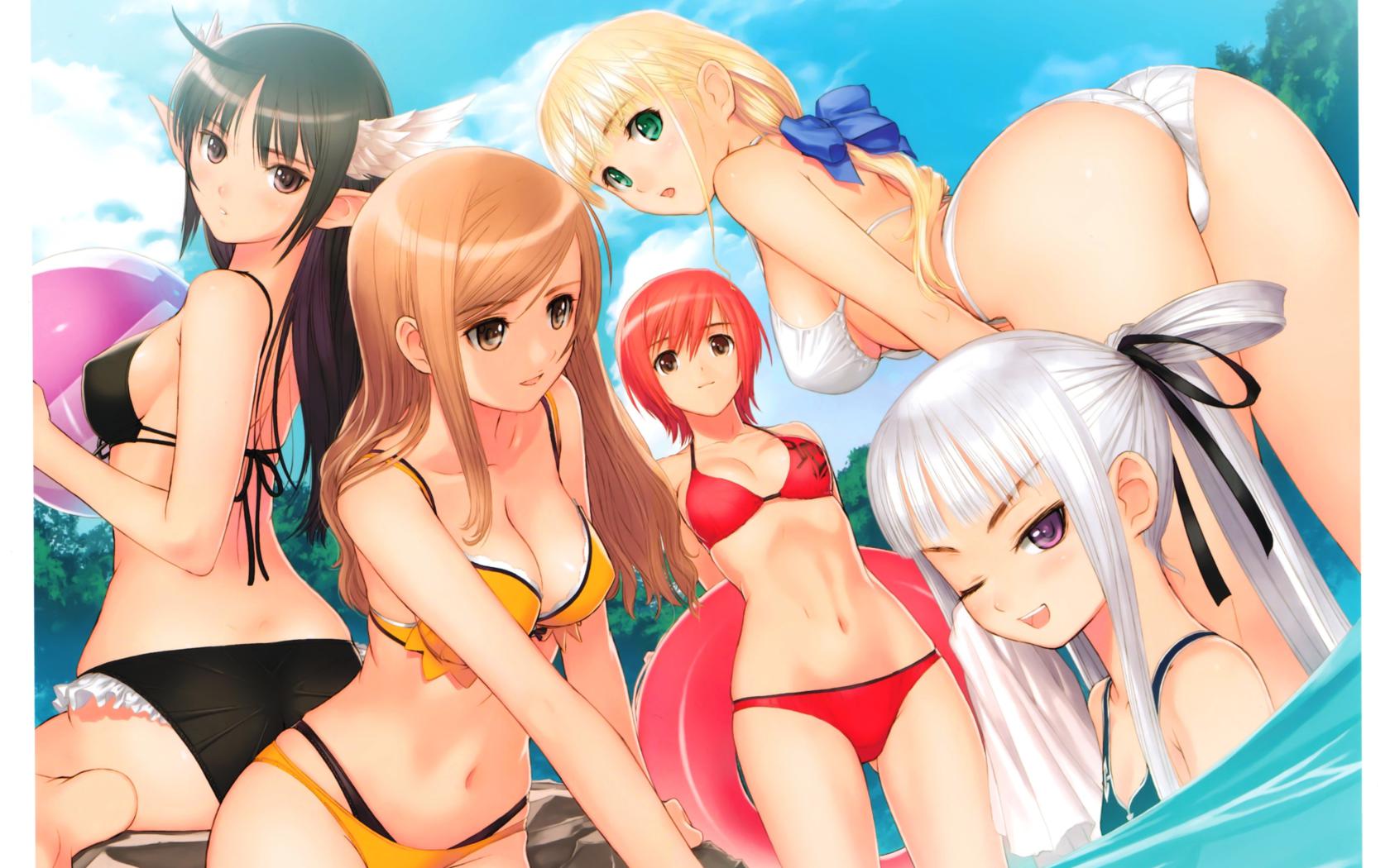 tony taka, hentai, hot, sexy, boobs, breasts, bikini, group, blonde, red-haired, dark hair, long hair, short hair, water, sea, ribbon, ass, sideboob, swimsuit, brown hair, green eyes, brown eyes, purple eyes, white hair, small boobs, big boobs, small brea