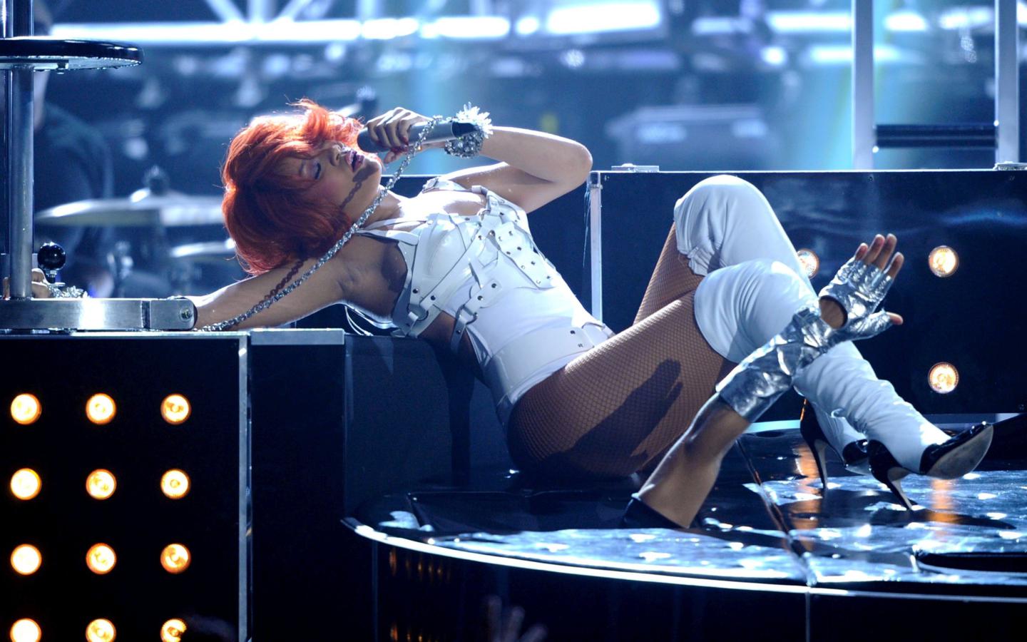 rihanna, exotic, barbadian, celebrity, singer, actress, brunette, sexy babe, on stage, singing, sexy dressed, white, pvc, lingerie, body, harness, bucket tops, legs, fishnet, pantyhose, high heels, erotic, real celebs wall, babes in boots