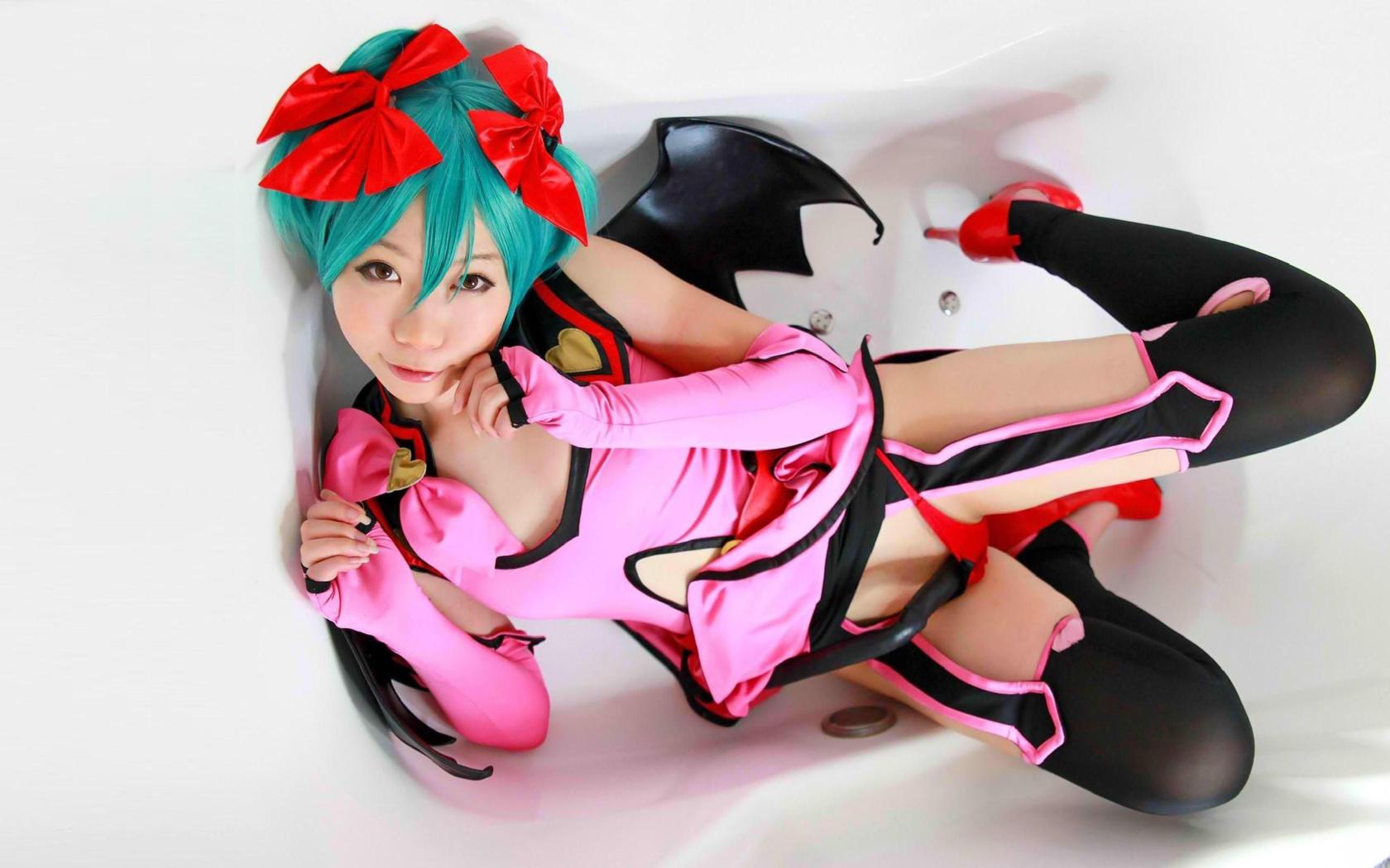 young, slim, exotic, sexy babe, asian, blue wig, cosplay, hatsune miku, posing, laying, bathroom, bathtub, sexy dressed, tight clothes, stockings, legs, red, high heels, erotic, re-up