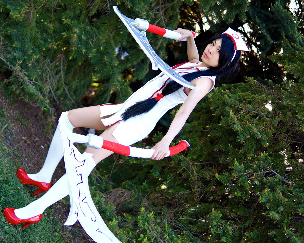 young, slim, exotic, cosplayer, amateur, asian, long hair, outdoor, sexy dressed, cosplay, nurse akami, tight clothes, nurse, uniform, knee socks, high heels, hi-q, weapons, axe, hello nurse