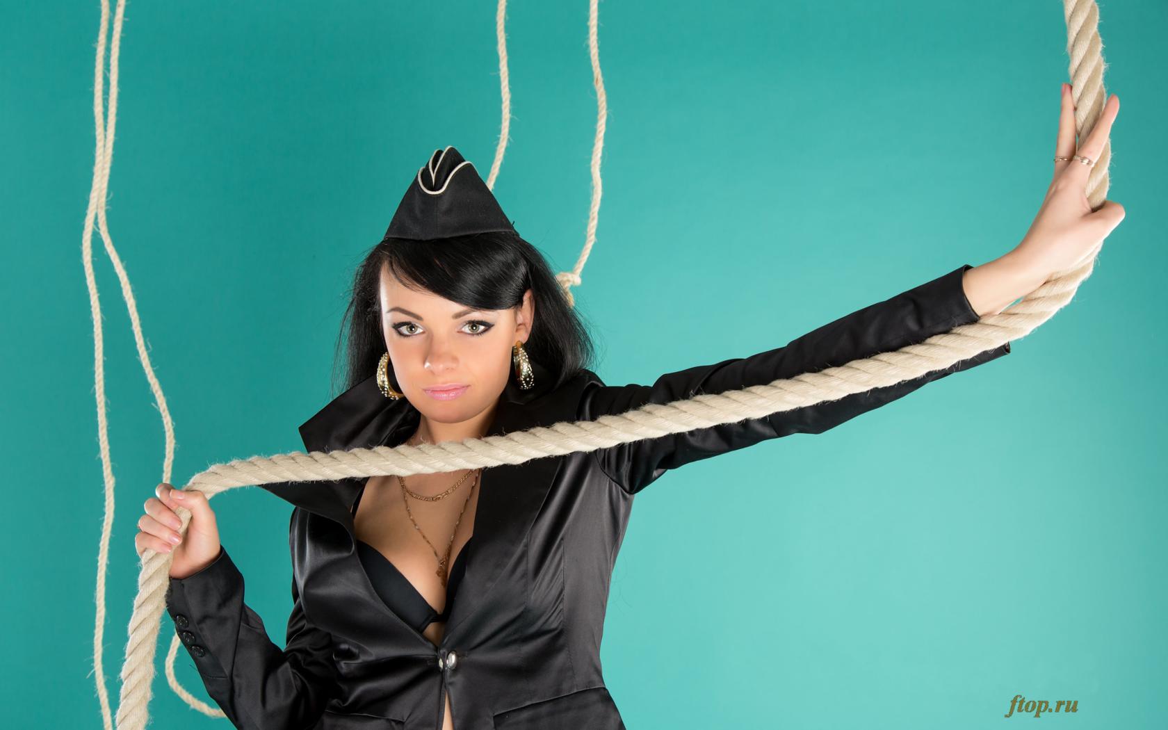 katie, brunette, sexy girl, adult model, :), beautiful, uniform, decollete, earrings, forage-cap, long hair, view, look