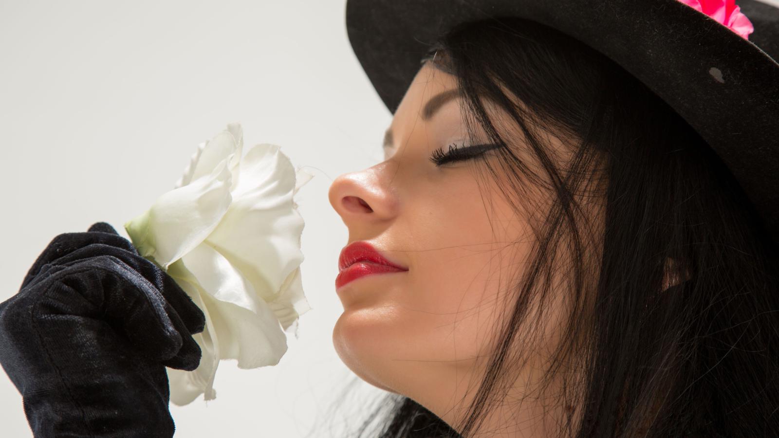 katie, brunette, sexy girl, adult model, long hair, flower, gloves, hat, gorgeous lips, lovely face, :), beautiful