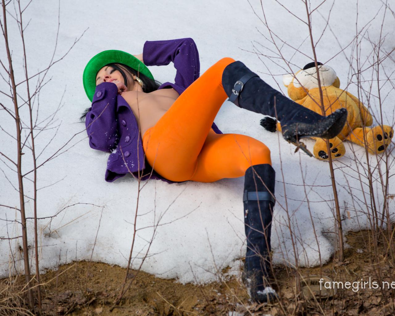 katie, brunette, sexy girl, adult model, lingerie, :), beautiful, leggings, orange, boots, snow, teddy bear, coat, hat, sexy legs, hi-q