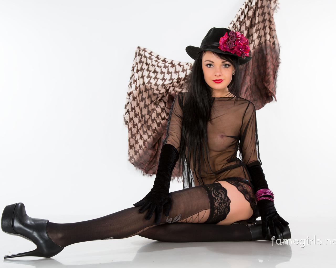 katie, brunette, sexy girl, adult model, lingerie, stockings, beautiful female legs, high heels, peignoir, hat, lingerie series